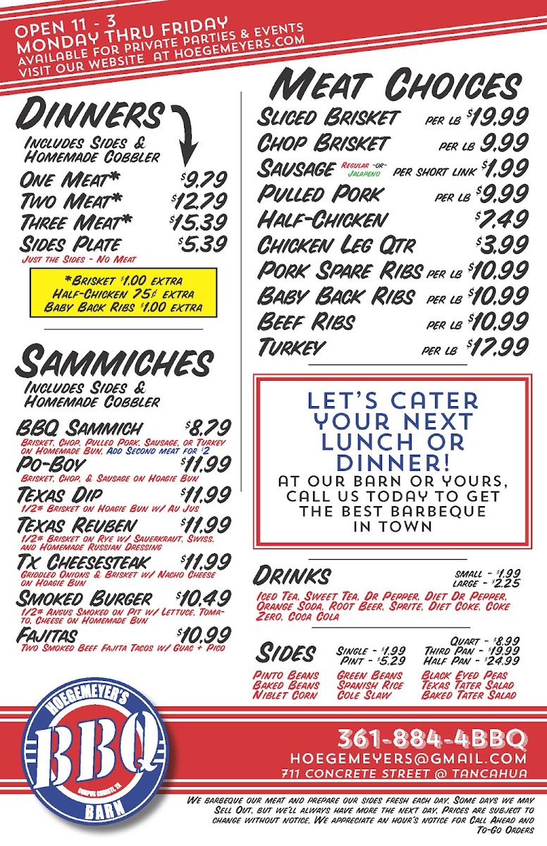 Welcome to Hoegemeyer's Barbeque Barn, a true gem nestled in Corpus Christi, Texas. This vibrant eatery specializes in mouthwatering barbeque offerings that ensure each bite is a flavor-packed experience. The menu features standout items like Angus brisket smoked to perfection, tender baby back ribs, and savory jalapeno sausage, all showcasing their trademark seasoning techniques. For a hearty feast, their Texas Dip sandwich pairs succulent brisket with a side of flavorful au jus.